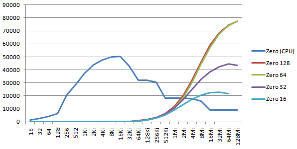 The graph below shows the throughput (in MB/s) for blocks of 2p bytes, from 16B to 128MiB. For the GPU zero, I tried various word sizes: 16-bit (short), 32-bit (int), 64-bit (long), 128-bit (float4).